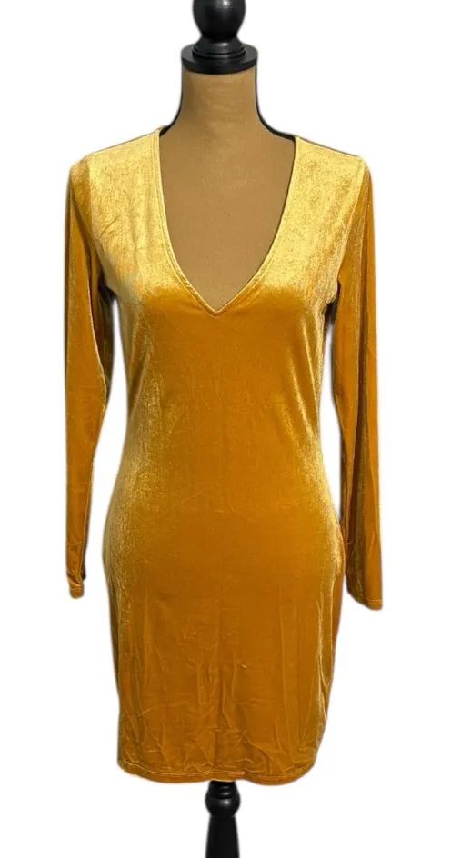 Gold velvet deep V bodycon mini dress with rich velour texture delivering major Glamcore, Holidaycor... Show more
