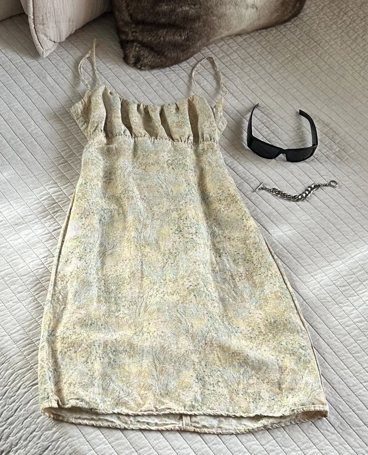 The print is so pretty and ethereal, earthy, neutral tone with light tan, blue, yellow, and olive. G... Show more