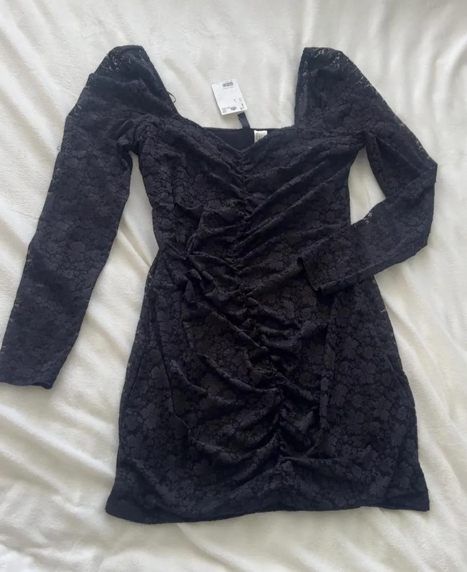 Long sleeve short dress, lace detailing throughout. Super stretchy. Ruched front for a cute club loo... Show more