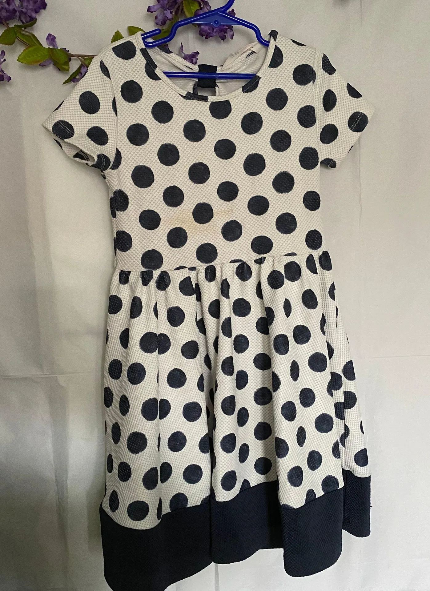 H&M Little Girls fit and flare dress with navy blue polka dots and white background. Textured fabric... Show more