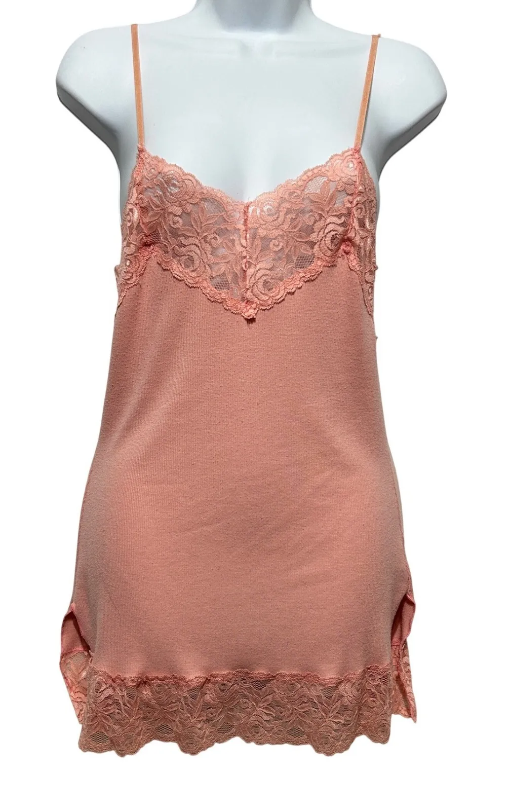 Fitted Y2K Peach Lace Trim Cami Top Features: •ribbed cotton blend knit with lace trim detail, mach... Show more