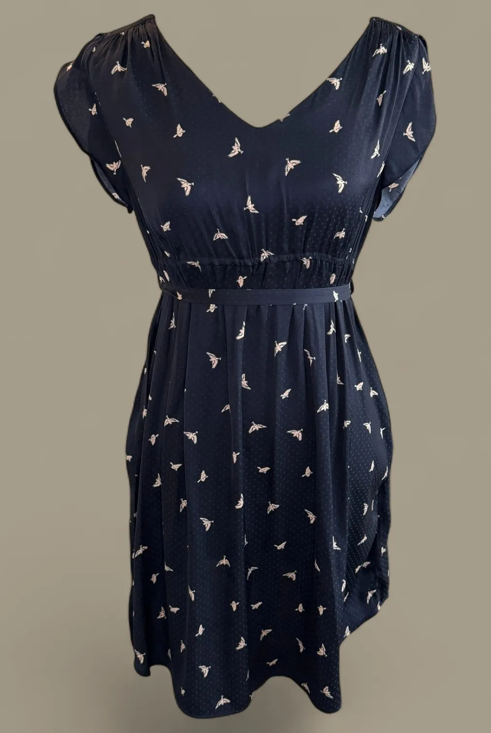 Charming H&M Mama maternity dress in navy blue with an allover blush bird print. Features flutter sl... Show more