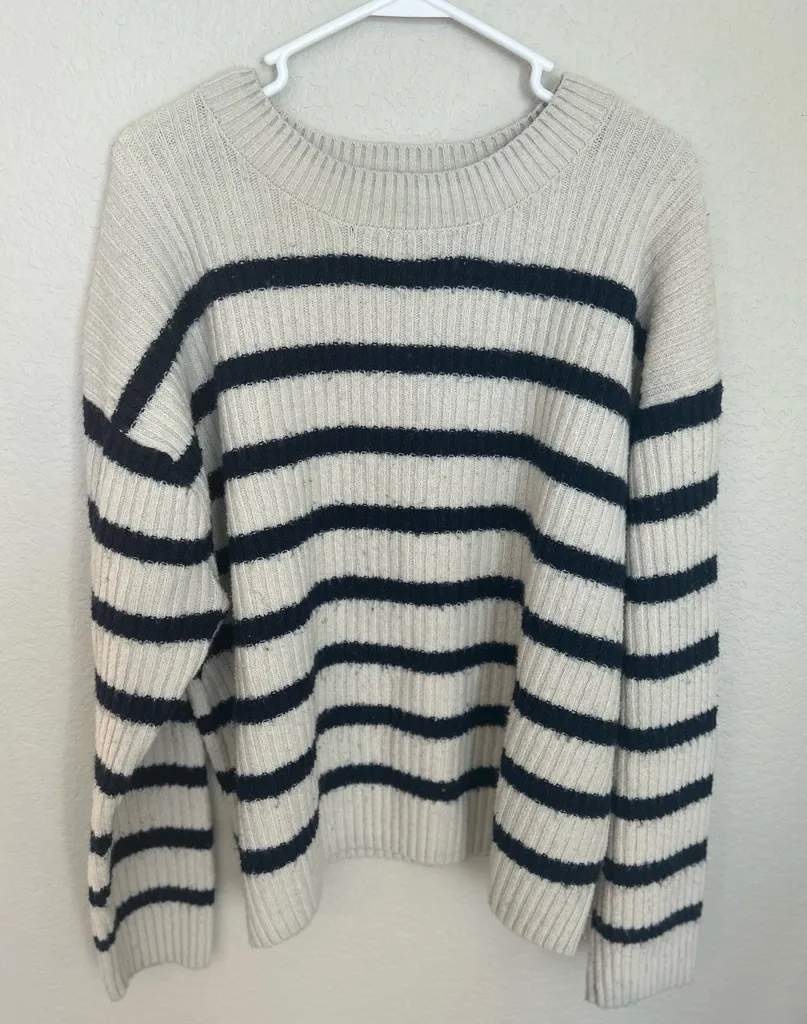 The H&M Navy and Cream Striped Sweater in size XXL for women is a stylish and versatile addition to... Show more