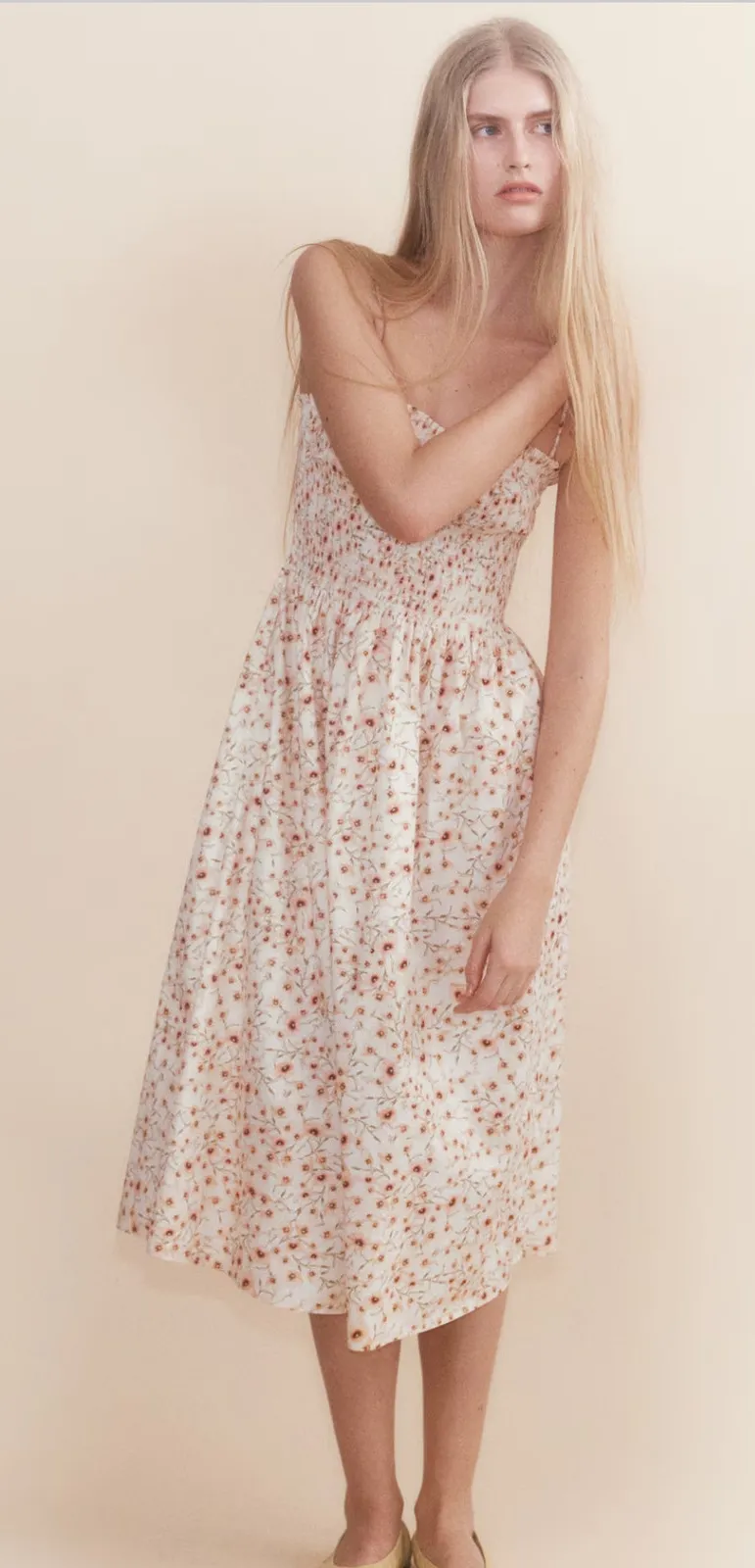 Excellent condition - no snags, holes, or stains Smocked through the chest with a sweetheart necklin... Show more