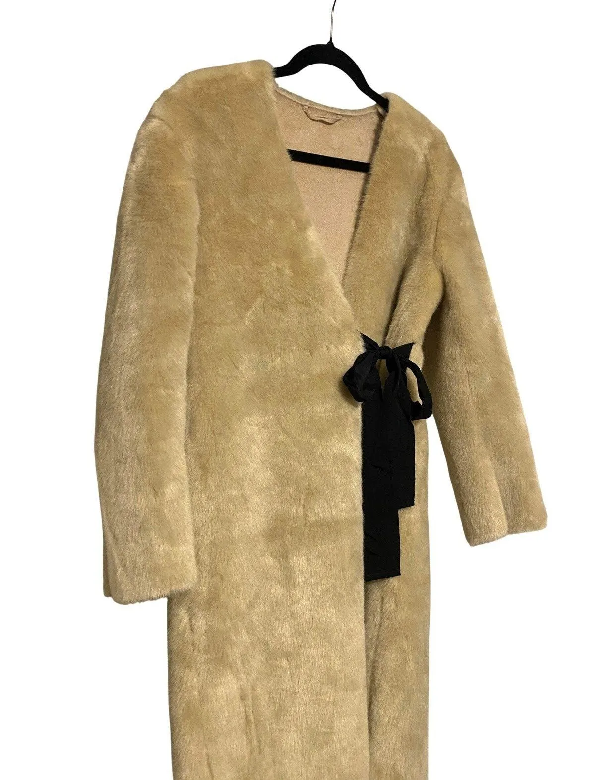 Chic vintage inspired old hollywood scandigirl beige faux fur longline coat with a black ribbon wrap tie detail.