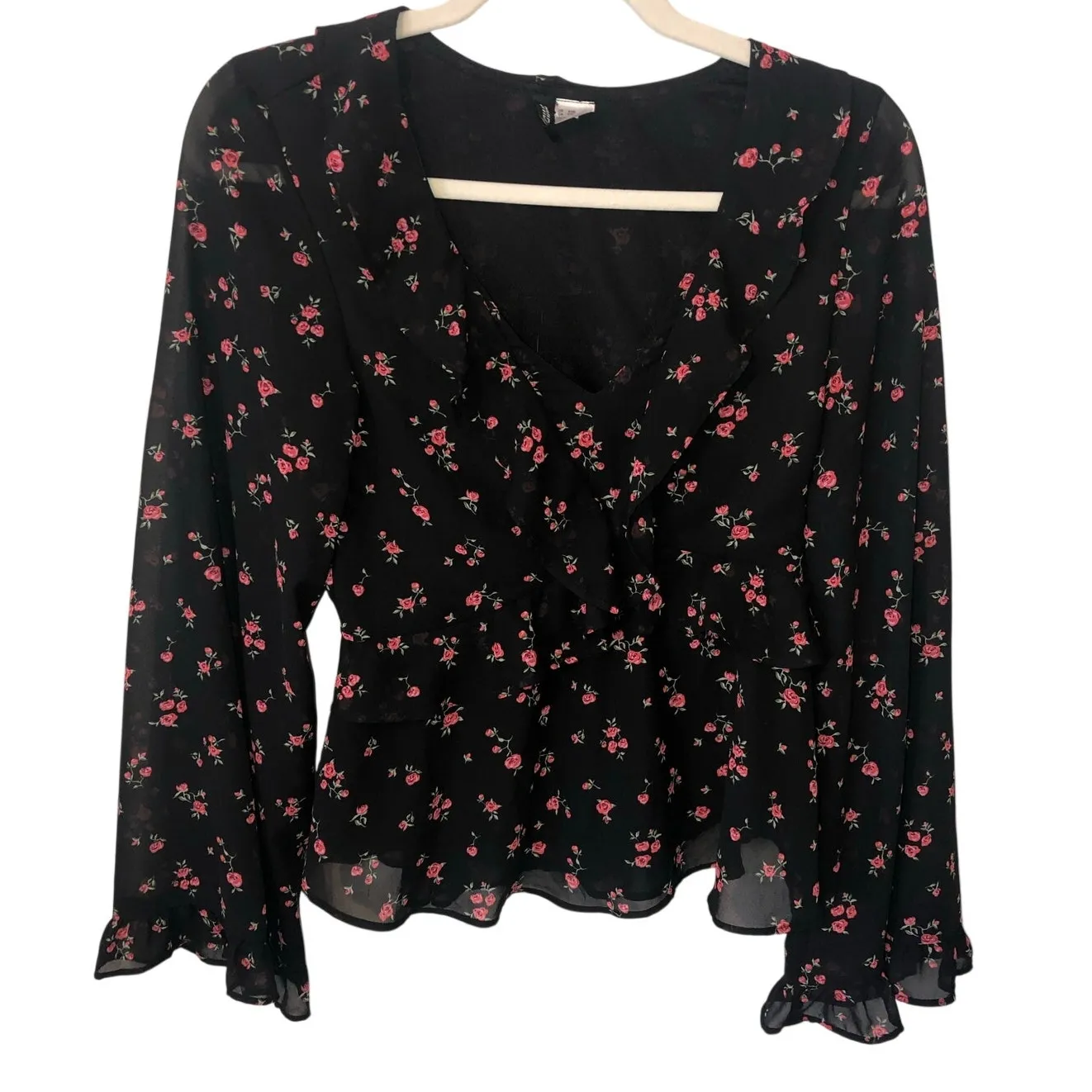 Ruffle Sleeve Top Size XXS Black Pink Floral Whimsigoth Dark Fairy Cottagecore Y2K Long sleeves v ne... Show more