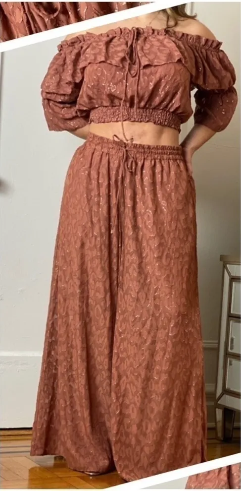 H&M Rust Orange Brown Cheetah Wide Leg Pants & Bardot Crop Top Set Size 12 Large Brand: H&M Size:... Show more