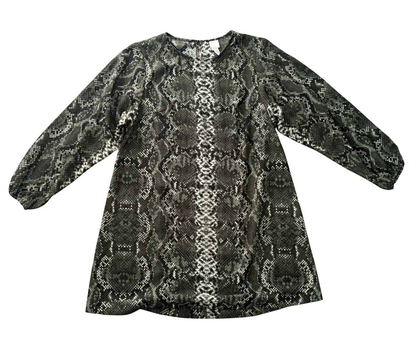 Keywords: snakeskin dress, animal print dress, H&M dress, mini dress, long sleeve dress, size 8 dress, women's dress, party dress, casual dress, fashion dress, printed dress, green dress, gray dress, stylish dress