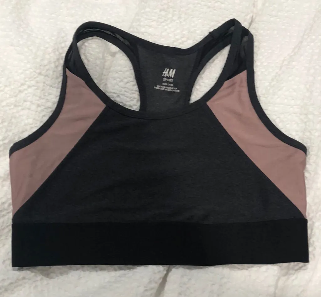 Super stylish H&M sports bra. Size M. Band on the bottom. No padding. Pink shimmery on the side. Mes... Show more