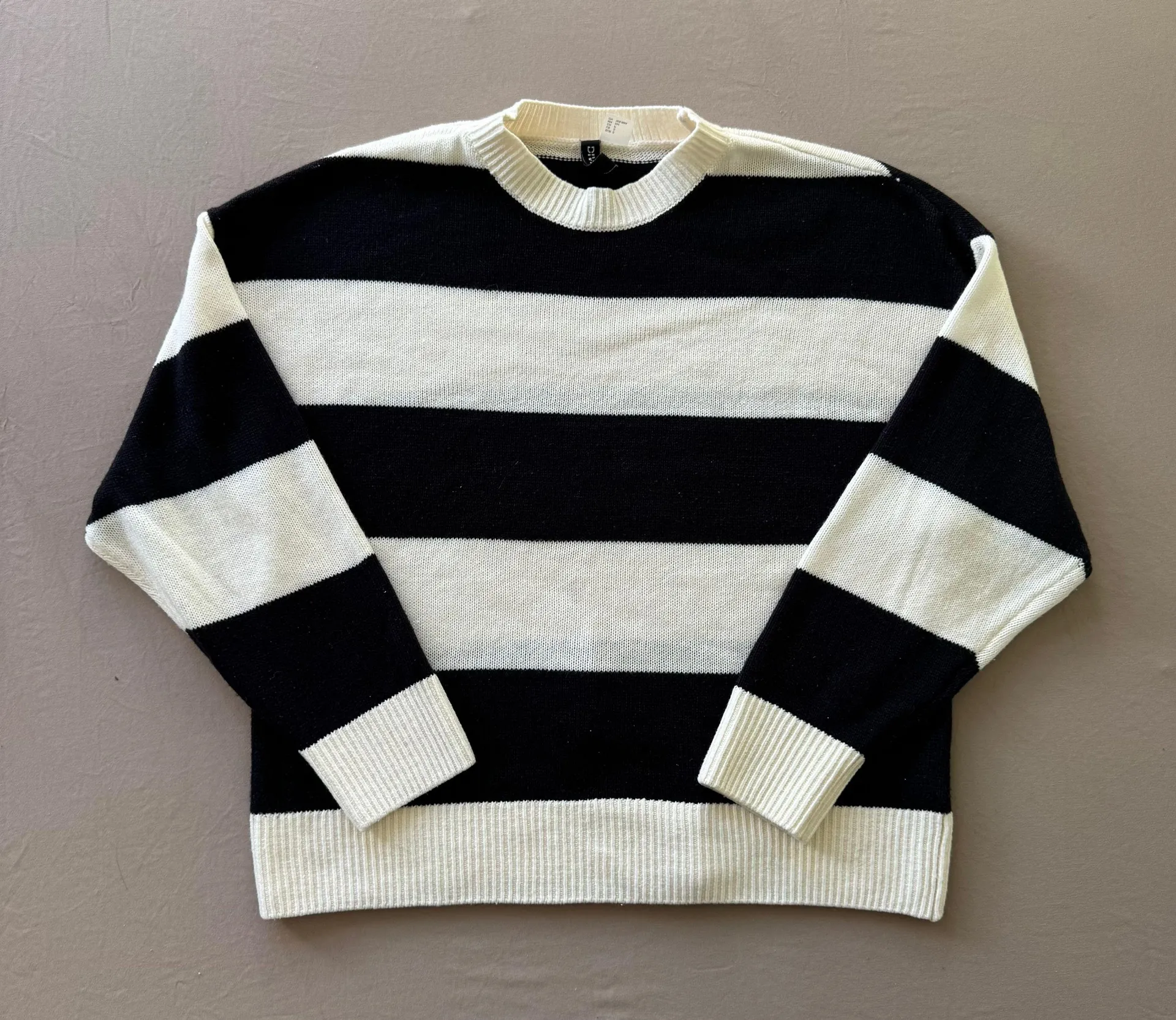 - cool & classic, this timeless Knit crewneck by H&M features a staple striped print & rib knit cuffs, collar & hem, with a dropped shoulder. In a black & off white colorway