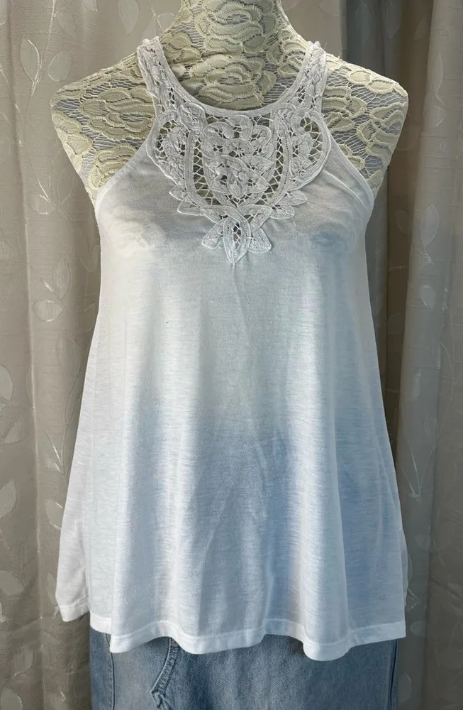 H&M women’s white halter tank top in size Small. Features a delicate lace crochet neckline with a fl... Show more