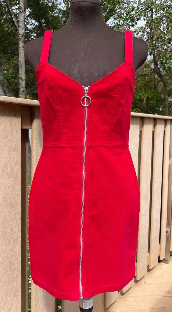 H&M Women’s Red Corduroy Jumper Dress with Zip Front, Size 6. Pit to pit 16” Length 32”