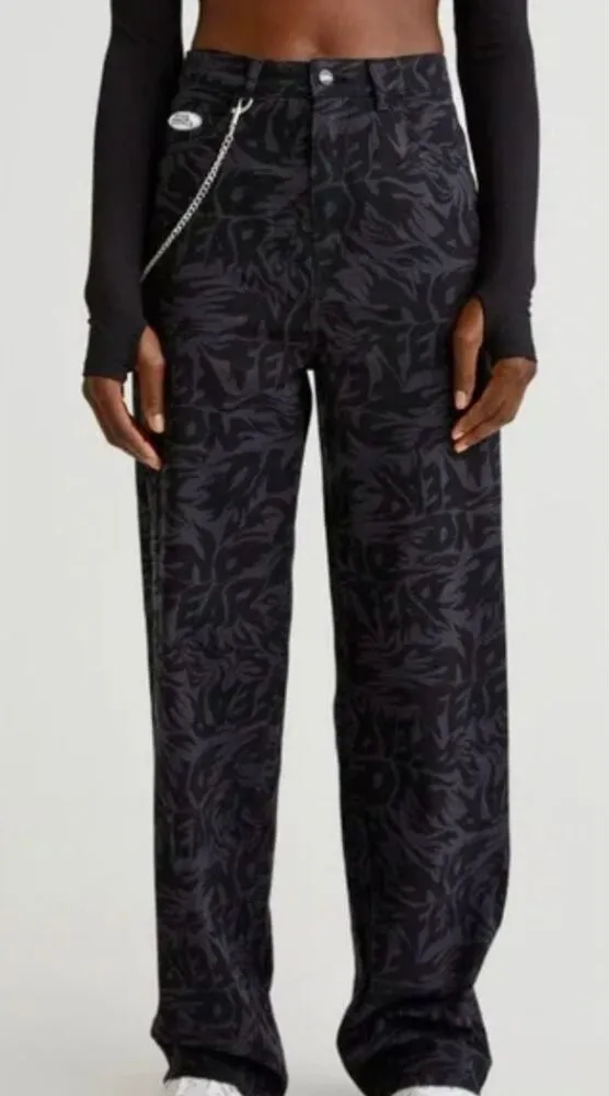 H & M x NO FEAR ~ High rise baggy fit gray and black graphic printed denim jeans in size 8 DIMENSIO... Show more
