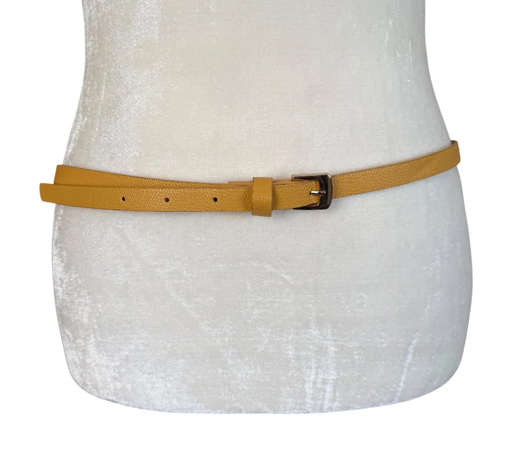 Women's H&M yellow leather adjustable skinny belt with gold buckle, size small. This is 40" Length... Show more