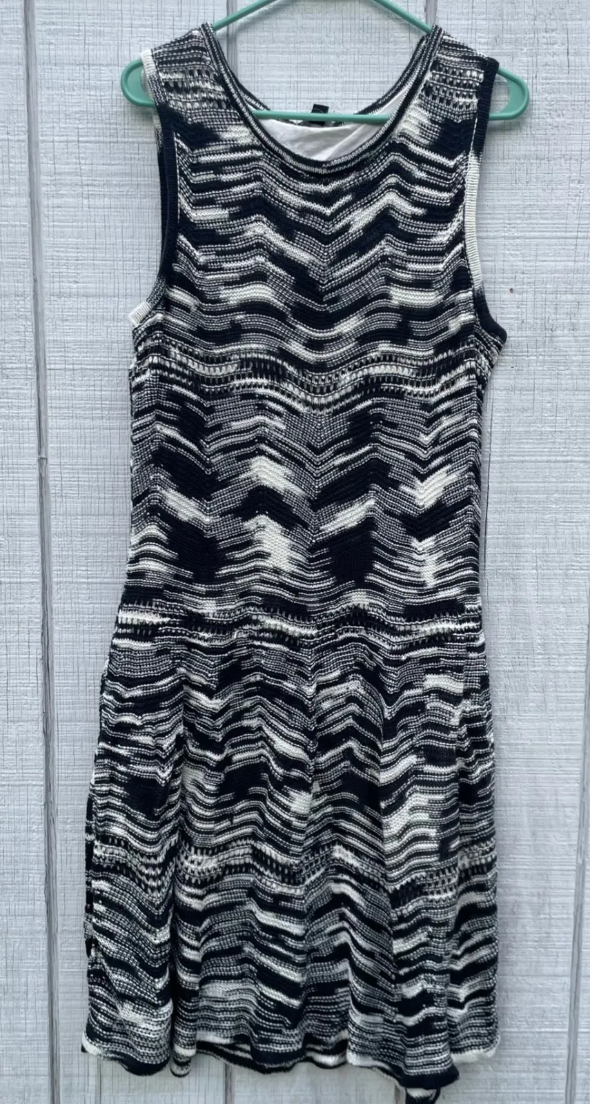 Pit to pit 21" Waist measured flat 18" Hips approx 25" Length 42" Style: Tank Dress, A-Line Dress Length: Knee Length Color: Black Department: Women Sleeve Length: Sleeveless Pattern: Chevron Occasion: Casual, Travel Material: Knit Neckline: Round Neck Character: Bohemian, Retro, Casual Chic, Summer, Boho Fabric Type: Knit Season: Summer, Spring Sleeve Type: Strapless Keywords: H by Halston, knit dress, chevron dress, sleeveless dress, casual dress, summer dress, black and white dress, womens dress, size L, retro dress, boho dress, bohemian dress 56