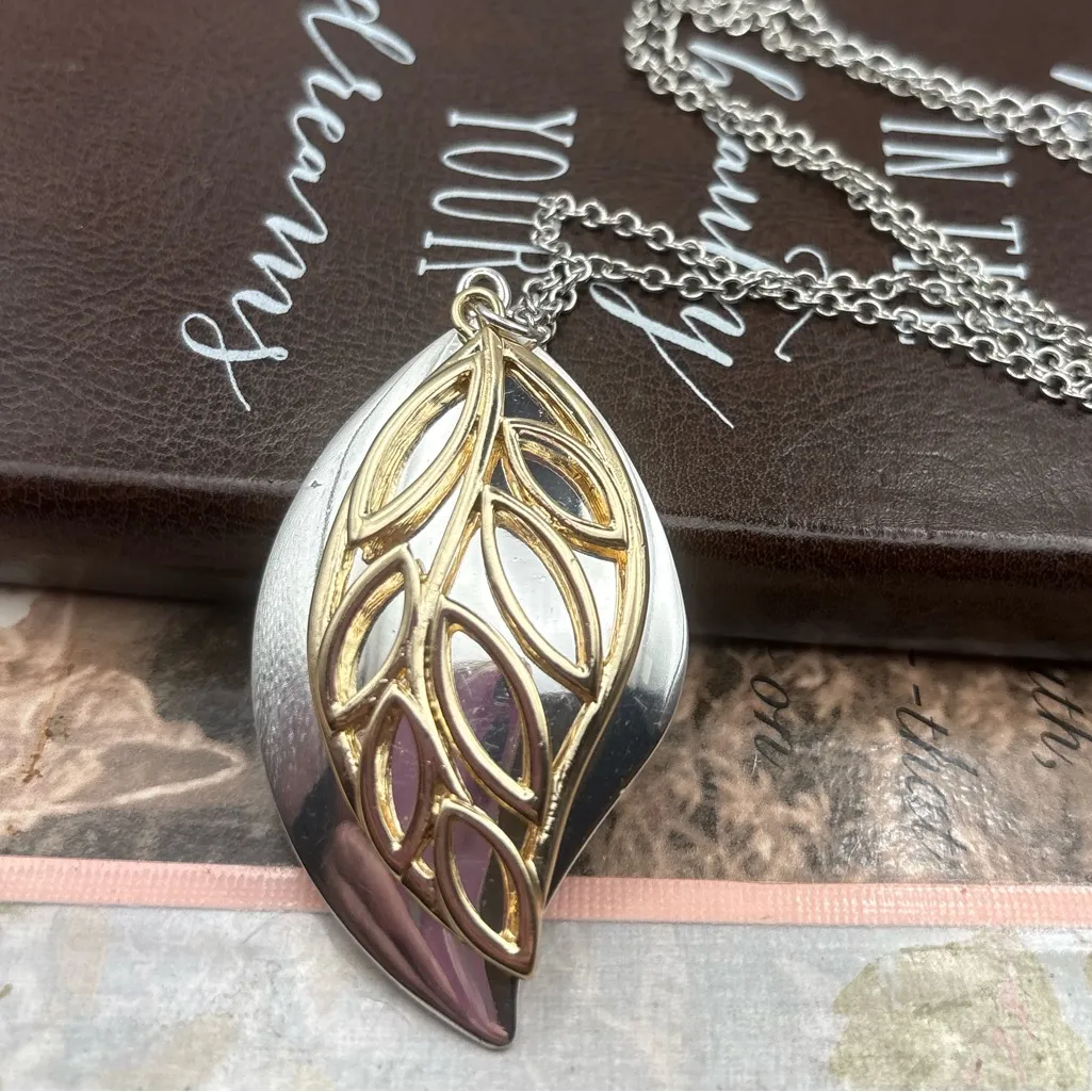 Vintage layered pendant necklace with silver-tone base + gold-tone cutout leaf overlay. A striking m... Show more