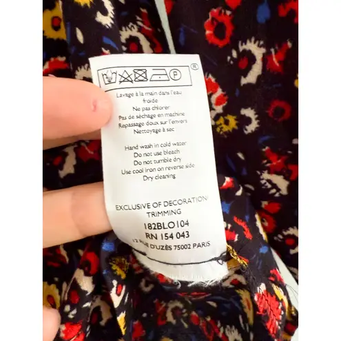 Sézane | Sezane Marina Floral Lace Blouse Women's size 34/2 Excellent pre-owned condition V-neck with lace detail Button back closure Darts 3/4 sleeves with lace cuffs 100% viscose Approximate flat measurements: Pit to pit: ~18.5" Length: ~24" Same or next business day shipping Smoke free, pet free home Thanks for looking! Sezane Marina blouse, floral lace blouse, Parisian chic top, feminine romantic blouse, navy floral blouse, vintage inspired lace trim, bohemian floral top, chic everyday blouse, French girl style, delicate lace detail blouse, effortless romantic top, timeless floral blouse, elevated feminine blouse, artisan inspired blouse, modern romantic style
