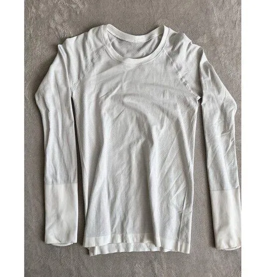 This is a Lululemon women's long sleeve white T-shirt in size 6. It features a crew neck, pullover closure, and is made of light blended fabric. The shirt is designed for activewear purposes like gym workouts, yoga, hiking, and camping. It has an athletic fit and is part of the Lululemon Swiftly Tech product line, suitable for sports activities like yoga.