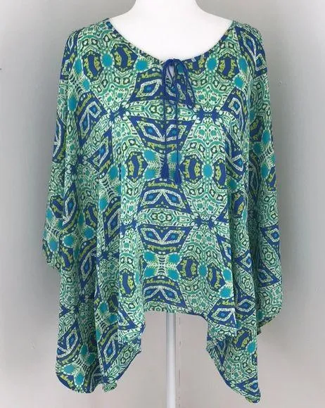 Brand new Jones New York blue, green and yellow print poncho with round neckline and blue cord tie w... Show more