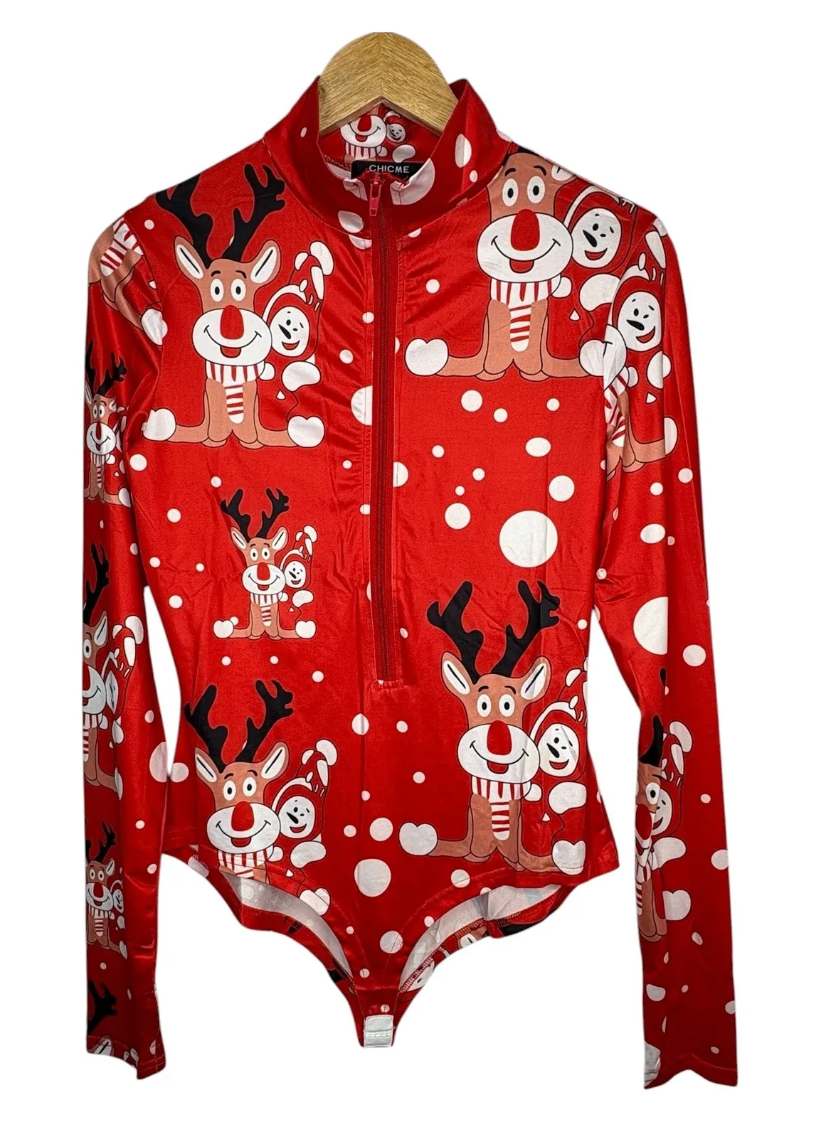 All orders shipped next business day. ChicMe Christmas Reindeer Snowman Print Zipper Long Sleeve Bodysuit Women Large A festive long-sleeved bodysuit showcasing a vibrant red background adorned with a playful Christmas print of reindeers, snowmen, and snow. This piece features a convenient zipper closure at the neckline, a mock neck for added style, and a snap closure at the crotch for easy wear. The stretchy fabric ensures a comfortable and flattering fit. Condition: Excellent Department: Women Size: Large, Length- 29", Pit to Pit- 19.5", Stretchy Type: Bodysuit Material: Cotton, Polyester Theme: Holiday, Christmas, Festive, Winter Keywords: Christmas bodysuit, Holiday fashion, Reindeer print, Snowman print, Zipper bodysuit, Mock neck top, Long sleeve bodysuit, Festive apparel, Party wear, Women's clothing, ChicMe, Christmas outfit TD2