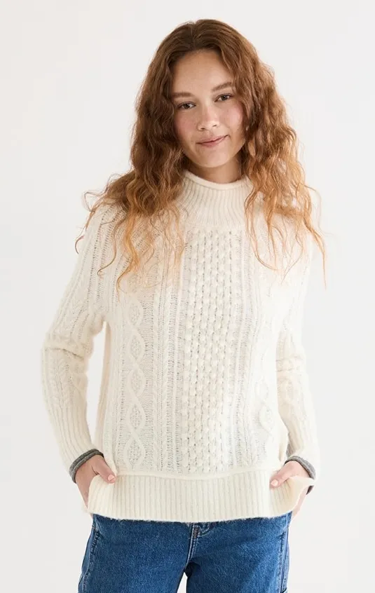 Elegant Alex Mill Camil Cable Knit cream turtleneck with intricate design and details. Soft and warm for any occasion size XS with no damage. Side slits and grey accents on the cuffs. “Fabric: Mid-weight cable knit Ribbed mock neck with long sleeves Side slits Contrast trim Pullover design, no closure Shell: 53% wool/30% polyamide/17% alpaca”