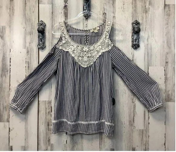 Vintage America Blues Cold Shoulder Off the Shoulder Blouse Top with Crochet Lace Neckline Detail in Blue Vertical Stripe Pattern and Womens Size Medium. Gently used and in excellent condition.