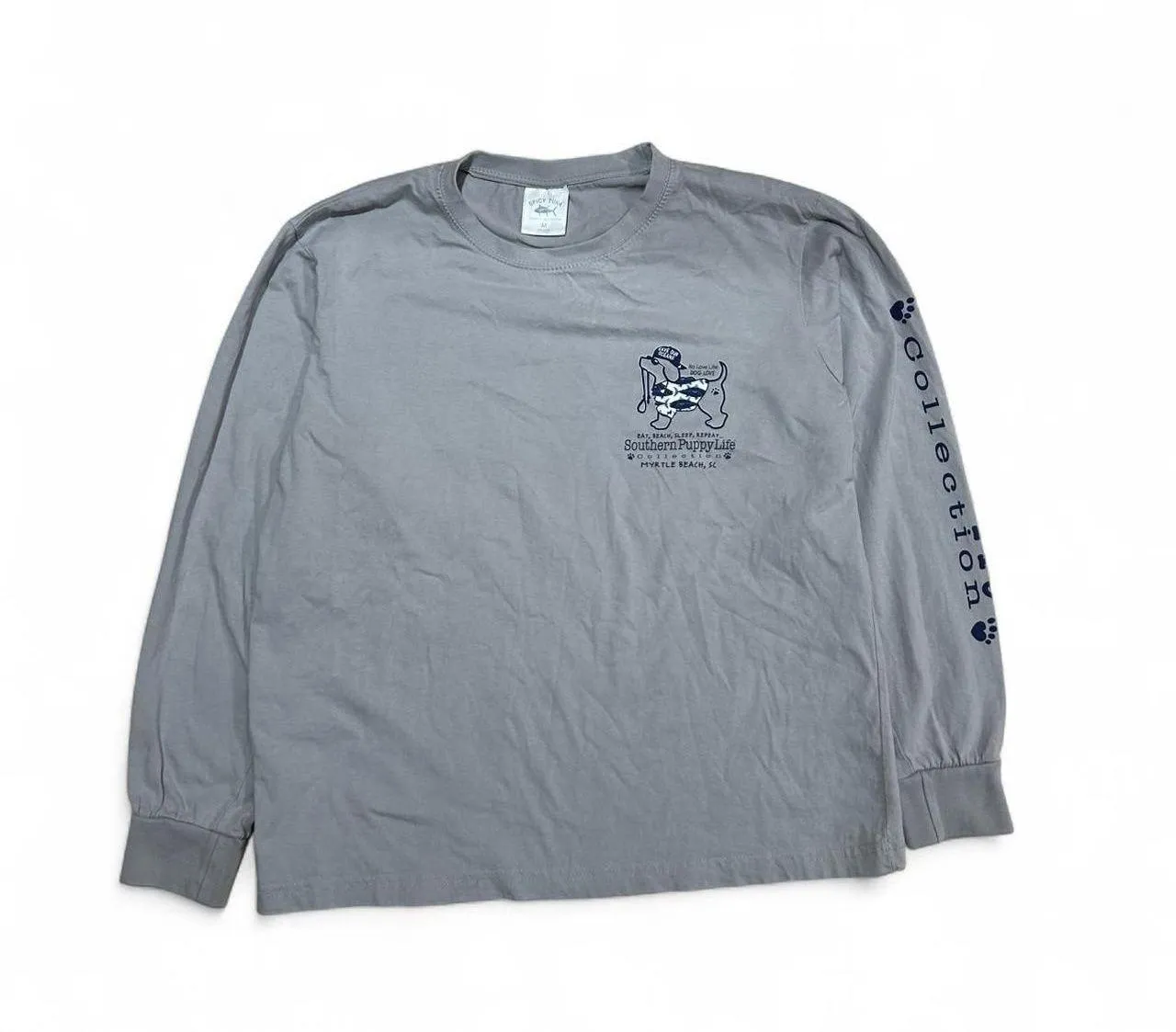 Long Sleeve T-Shirt | Brand: Spicy Tuna / Southern Puppy Life Collection | Size: M | Coastal / Casual Style Get the perfect coastal vibe with this grey long-sleeve tee from the Southern Puppy Life Collection by Spicy Tuna. It features an adorable graphic on the back of a dog wearing a "Save Our Oceans" hat and a fish-print vest, with a smaller version on the chest. The sleeve proudly displays "Southern Puppy Life Collection." It's the perfect casual top for beach days, relaxed weekends, or showing off your love for dogs and the ocean! #coastal #preppy #southernstyle #spicytuna #southernpuppylife
