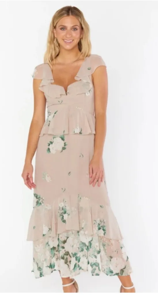 Elegant cream maxi dress featuring a floral design and ruffle details. Perfect for any occasion. Br... Show more