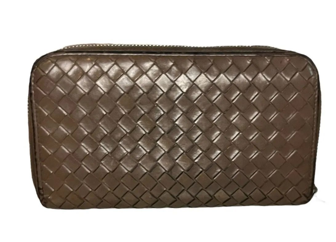 Bottega Veneta Continental Wallet, crafted in the brand’s signature Intrecciato weave. Made from buttery-soft taupe leather, this wallet embodies understated luxury and timeless sophistication. The sleek continental silhouette offers generous storage without sacrificing elegance – perfect for both daily use and special occasions. Taupe (a soft, versatile neutral) Signature Bottega Veneta Intrecciato-woven lambskin leather Interior: Multiple card slots, bill compartments, zippered coin pocket Closure: zip exposed Dimensions: Approx. [Insert Measurements – e.g., 7.5” W x 4” H x 1” D] Made in: Italy Missing zipper pull Coin pocket has staining Some wear on corners Please see photos for imperfections.