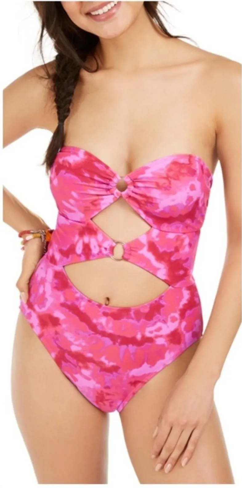 Hula Honey BERRY JAM TIE-DYE Hana Beach Cut-Out One-Piece Swimsuit Bohemian tie dye meets chic cutouts on this cool one-piece swimsuit from Hula Honey, finished with removable straps for versatile styling. Lined. Moderate bottom coverage. Pull on styling with tie closure at back; removable straps. Removable cups. Sweetheart neckline; ring hardware and cutouts at front. Style #: HHHBO110 Nylon/spandex;