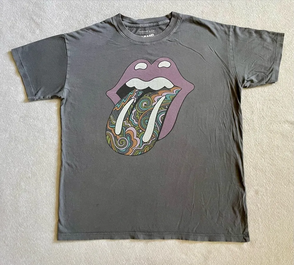 Features the iconic tongue logo in a colorful, psychedelic swirl design on a gray background. Made... Show more