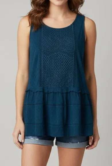 Style Tags: Knox Rose, Sleeveless, Tank Top, Blue, Teal, Peplum, Tiered, Lace, Embroidered, Summer, Spring, Casual, Boho, Bohemian, Chic, Flowy, Lightweight, Vacation, Beach, Resort Wear, Everyday, Festival, Layering, Ruffle, Contemporary