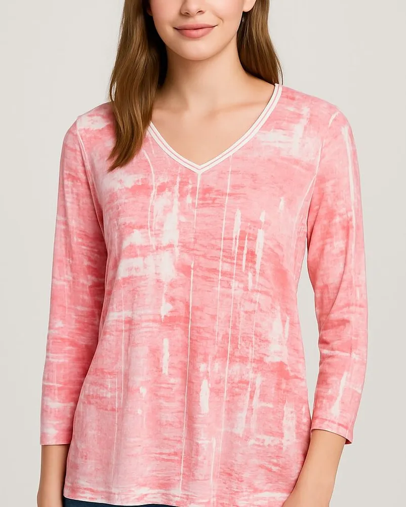 Pullover styling Pink 3/4 sleeves Slight hi-low hemline All over abstract print Lightweight and brea... Show more