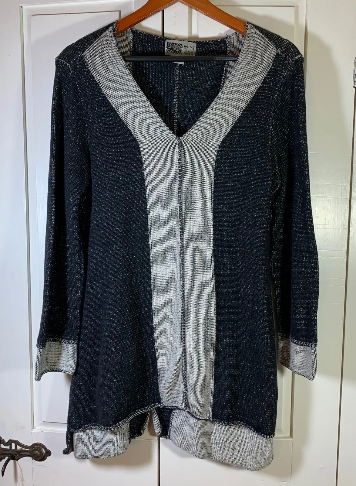 Habitat Clothes to Live In women's knit tunic sweater. This stylish top features a flattering V-neckline and a unique colorblock design with a central grey stripe and contrasting black speckled knit. The long sleeves are finished with grey cuffs, and the hem has a subtle split detail. Perfect for casual outings or relaxed office days. Style: Tunic Department: Women Material: 100% Cotton Neckline: V-Neck Theme: Nature Sleeve Length: Long Sleeve Type: Sweater Features: Open, All Seasons Pattern: Solid Sleeve Type: Raglan Sleeve Fabric Type: Knit Fit: Relaxed Occasion: Casual, Travel Garment Care: Hand Wash Only Country of Origin: China Unit Type: Unit Keywords: Habitat, knit sweater, tunic, V-neck, colorblock, speckled, casual, office wear, long sleeve, cotton blend, women's fashion, pullover, everyday wear