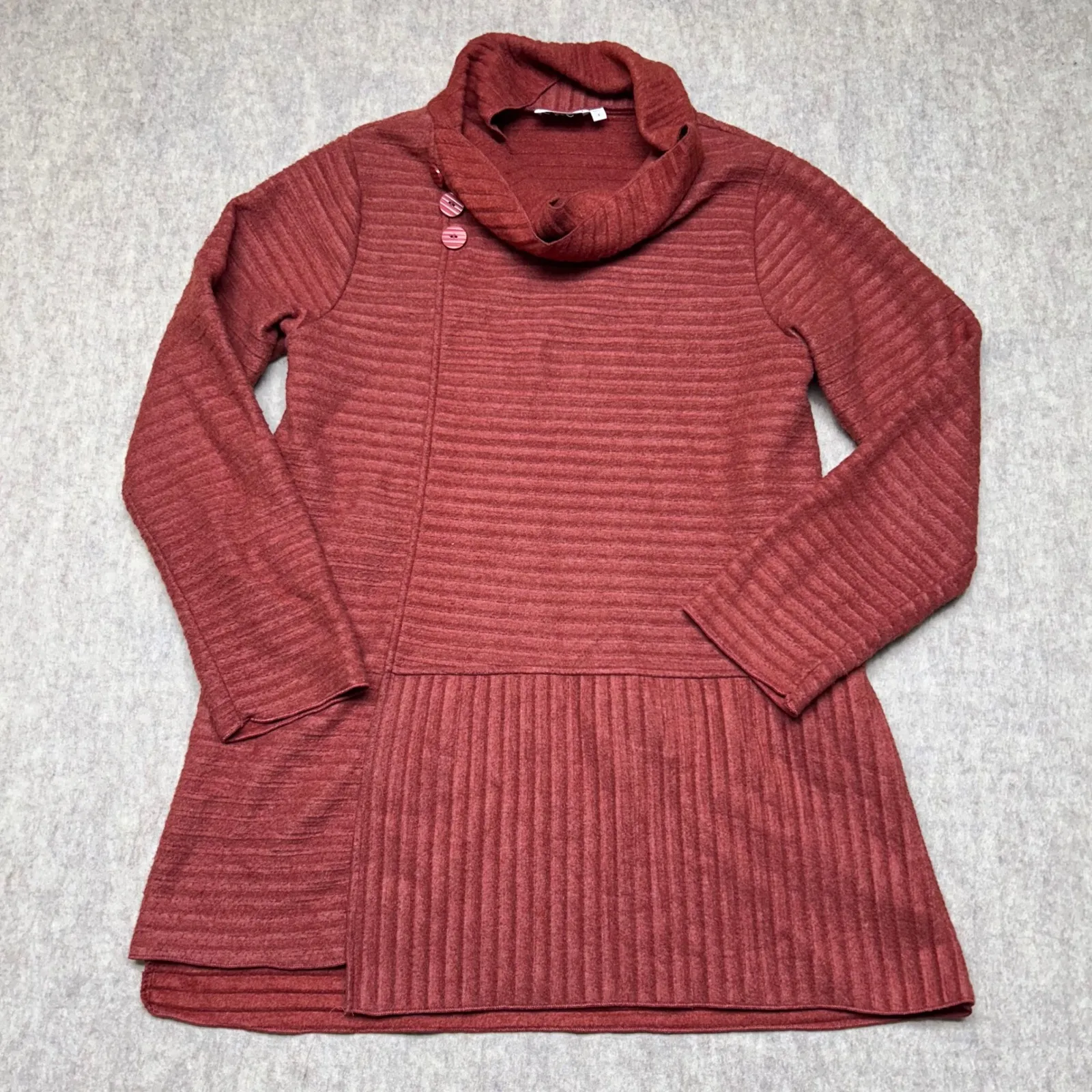 Habitat textured tunic sweater in a burnt orange hue. This piece features a unique asymmetrical cowl neckline with decorative buttons on the left side. The textured ribbed knit is present throughout the body and sleeves, with a contrasting vertical ribbed pleat detail accentuating the flared hemline. Perfect for layering during cooler months, this sweater is ideal for casual outings or relaxed office days. Measurements: • Chest: 21 in • Length: 34 in • Sleeve Length: 25 in • Hem Width: 27 in Style: Tunic Department: Women Material: Polyester, Rayon, Spandex Neckline: Cowl Neck Type: Sweater Sleeve Length: Long Sleeve Features: Stretch Pattern: Striped Sleeve Type: Flared Sleeve Fabric Type: Knit Accents: Button, Pleated Keywords: tunic sweater, cowl neck, textured knit, ribbed, pleated hem, asymmetrical neckline, button accent, orange, fall fashion, winter wear, casual style, workwear, layered look