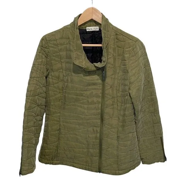 Title: Habitat Dusty Pistachio Green Art-to-Wear Zip Quilted Jacket Coat Size XS Asymmetrical zip closure Zip sleeve cuff Perfect for fall and spring Features: Brand: Habitat Type: Jacket Style: Casual Size: XS Color: Olive Green Material: 60% Cupro 40% Rayon Lining 100% polyester Condition: Excellent Condition All measurements are done laying flat and are approximate. Pit to pit 19” Length 24” Thank you for browsing my closet. If you have any questions feel free to message me. 5 star seller ⭐️ Bundle and Save 🛍️ Smoke free home 🏠 Next day ship📦 Description: