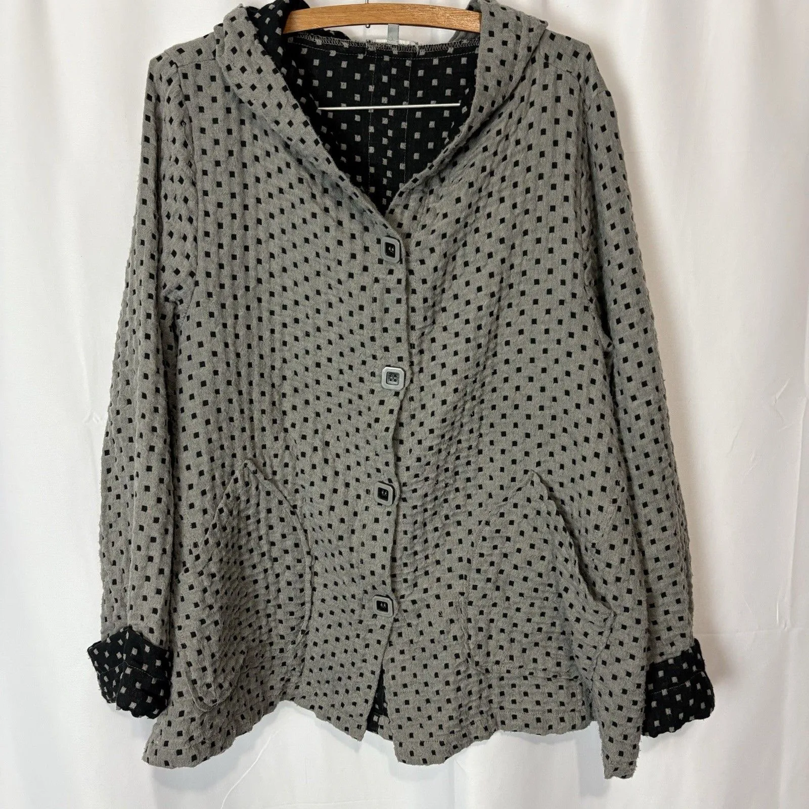 The Habitat Jacket in gray and black is a stylish and versatile piece for women. Made from a comfortable cotton blend with a knit fabric type, this short jacket features a relaxed fit and long sleeves with button closures. The animal print pattern and square swing pockets add a unique touch to this art to wear Lagenlook piece, perfect for a party or casual occasion during the winter and fall seasons. With accents like buttons and stretchy material, this jacket combines fashion and functionality for a chic look. Measurements (approximate, from flat lay): Pit 24 Length 27.5