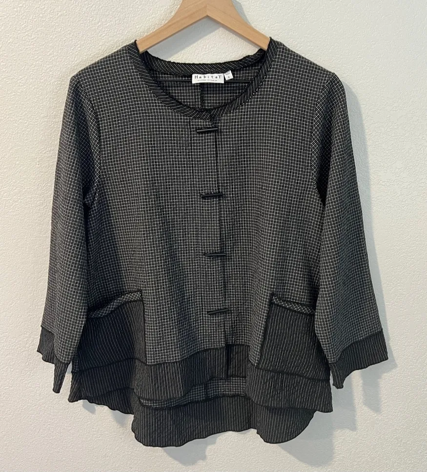 Habitat Lightweight Black & White Grid Print Cropped Sleeve Jacket Topper Size S Chic lightweight topper jacket with a black and white grid pattern. Ideal for versatile styling. relaxed fit lightweight textured material grid print toggle buttons cropped sleeves swing silhouette high low hem artsy lagenlook
