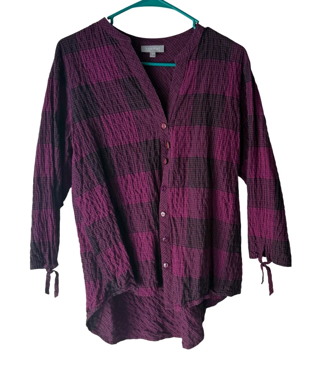 Habitat tunic shirt in a purple and black plaid pattern. Features a V-neckline with a collarless band, long sleeves with tie details at the cuffs, and a full button-up front. The hemline is high-low and curved. The fabric has a crinkled texture. Measurements: • Bust: 18 in • Length: 22 in Type: Blouse Department: Women Style: Tunic Material: Cotton, Spandex Neckline: V-Neck Sleeve Length: Long Sleeve Sleeve Type: Casual Sleeve Pattern: Plaid Accents: Button, Strap Features: Slit Fit: Relaxed Fabric Type: Woven Occasion: Casual Closure: Button Season: Fall, Spring Garment Care: Machine Washable Keywords: Habitat, plaid tunic, crinkle fabric, long sleeve shirt, button down, tie cuff, high low hem, casual top, boho tunic, textured shirt, fall fashion, spring style FAQS: We ship out items every 1-2 days due to high volume shipping the mail carrier does not scan the items until it reaches the next facility.This can take up to 48+Hours for tracking to update. We provide measurements in the photos as well as the descriptions. We add as many details as possible until the item is put into inventory. We are unable to take the item out of inventory for additional information. Due to a high volume store we are unable to answer these questions individually.