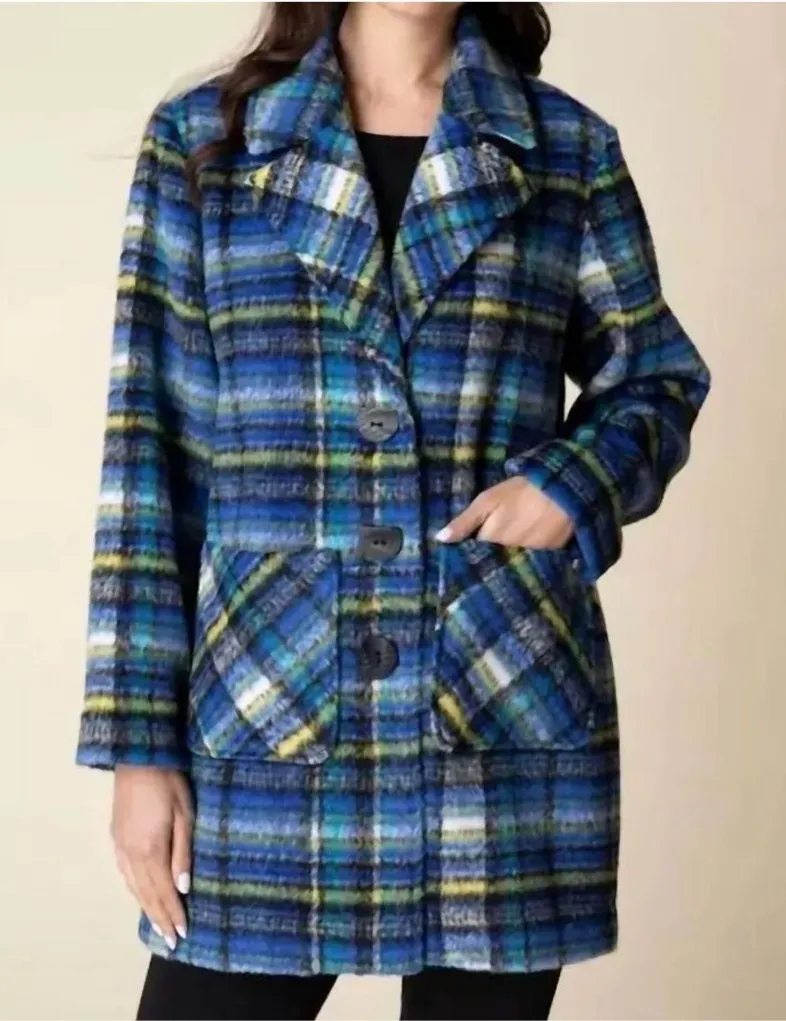 Habitat Tartan Plaid Blue Car Coat Button Front Fuzzy Knit Longline Jacket Size: Large This Car Coat features a soft fuzzy knit and a longer length for ultimate comfort, style and added warmth. With 2 front pockets and a multi color sapphire blue plaid pattern, it offers beauty, practicality and sophistication. Perfect for any individual seeking a versatile and stylish addition to their wardrobe this fall. Button Down Front Notched Lapel Color Long Sleeves 2 Front Pockets 100% Polyester Care: Dry clean In perfect, like new condition! Approx. Measurements: Length: 32.5" down from back base of neck Across underarms: 23" Shoulder seam to end of sleeve: 23.75" C2