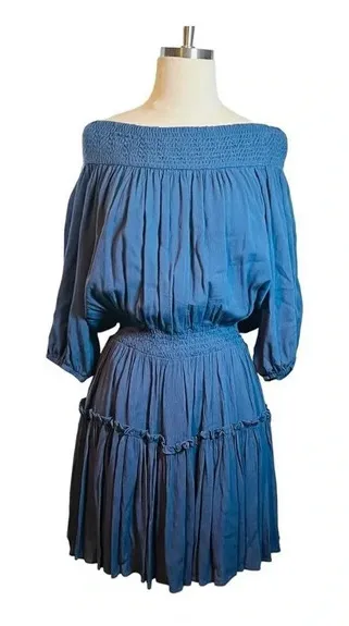 All orders ship next business day! Hailey & Co Off The Shoulder Tiered Dress, flowy, rayon, elastic around the shoulders and waist, lined, beautiful blue, women's size large. Condition: clean, excellent condition Color: blue Size: Large, Length- 29.5", Pit to Pit- 21" (approximate) Material: 100% rayon casual, comfortable, rayon, tier, tiered, layer, layered, ruching, flowy, flowing, shoulder, sexy, cute, fun, party, wedding, event Smoke free and pet free home!
