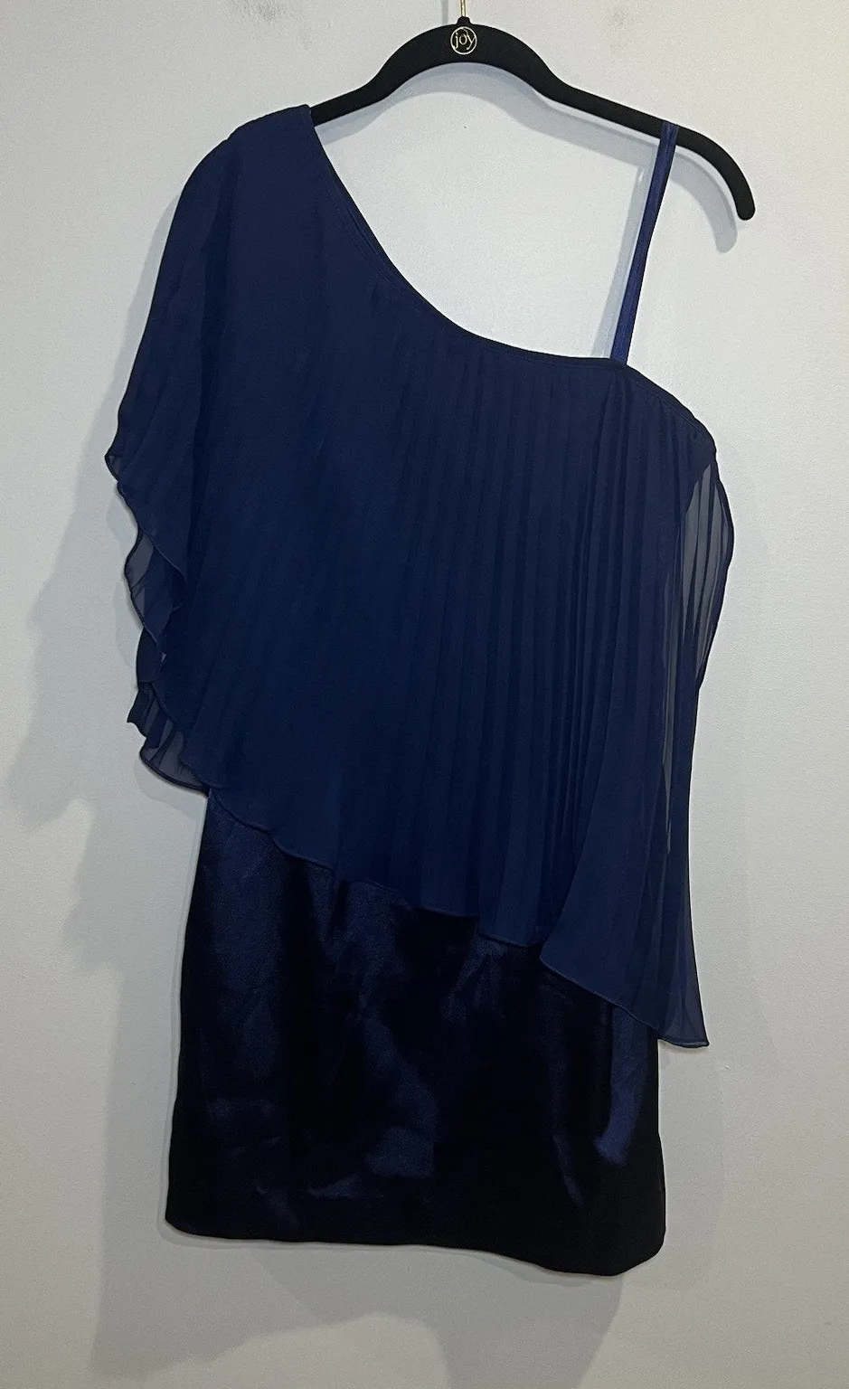 Hailey Logan by Adrianna Papell Great Pre-Owned Condition (see pics for details) Features: one shoulder pleated cape mini dress, side zip closure lined • Flaws: No Holes, stains, or tears • We are happy to answer your questions! • Washing Instructions: machine wash Size: 9/10 Color: navy blue Tags: formal, party, cocktail, event, special occasion, Measurements are approximate: length 33 1/2”, chest 18”, waist 30”, hips 38” Smoke Free Green Seeing: We ship out the next business day.
