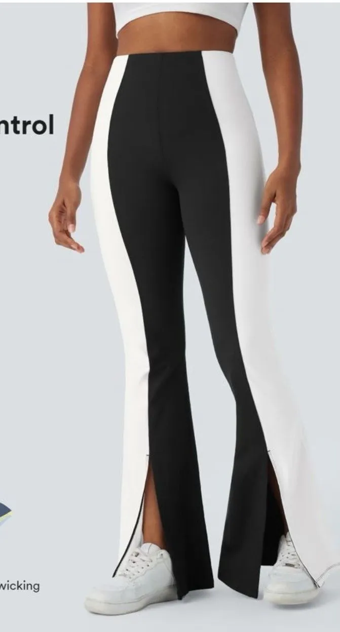 These high waisted leggings by Halara in size Medium feature a stylish color block design in black and white, perfect for travel, activewear, or casual outings. Made from polyester blended fabric, these leggings offer a flattering fit with a high rise and tummy control hem. The flare style adds a touch of flair while the elastic waist ensures comfort and stretch. Ideal for yoga or everyday wear, these leggings are machine washable and easy to care for, making them a versatile and chic addition to any woman's wardrobe.