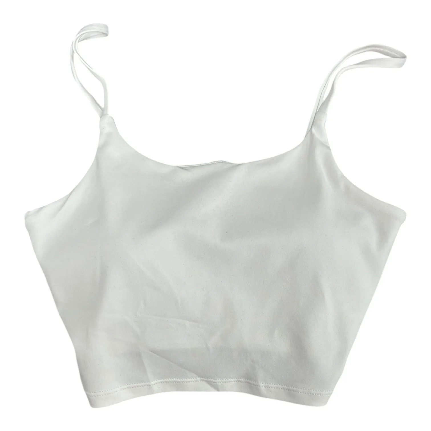 White cropped athletic tank top. This camisole features thin adjustable straps and a square neckline. The back has a racerback style design for comfortable movement. The fabric appears to have a smooth finish. Inner shelf bra. This customer return item has some dust and a small makeup mark on the inside of the neckline and has been discounted accordingly. Department: Women Type: Tank Style: Cropped Features: Straps, Padded Neckline: Square Neck Performance/Activity: Yoga, Gym & Training Sleeve Length: Sleeveless Closure: Pullover Pattern: Solid Strap Type: Spaghetti Compression Area: Chest, Back Fabric Type: Jersey Occasion: Activewear, Casual Season: Summer, Spring Keywords: athletic, camisole, cropped, sporty, activewear, workout, gym, layering, basic, summer, smoky, dusty Smoke free, pet friendly home. Thanks for visiting!