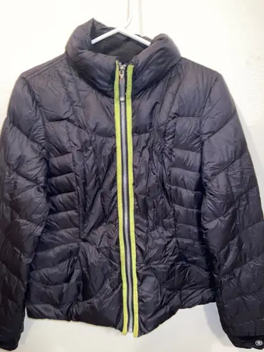 Super light and puffy down jacket! Keeps you SO warm, but can also scrunch down into a little bag, such a great quality from Nordstrom. Only neon green detail on zipper, everything else is black.