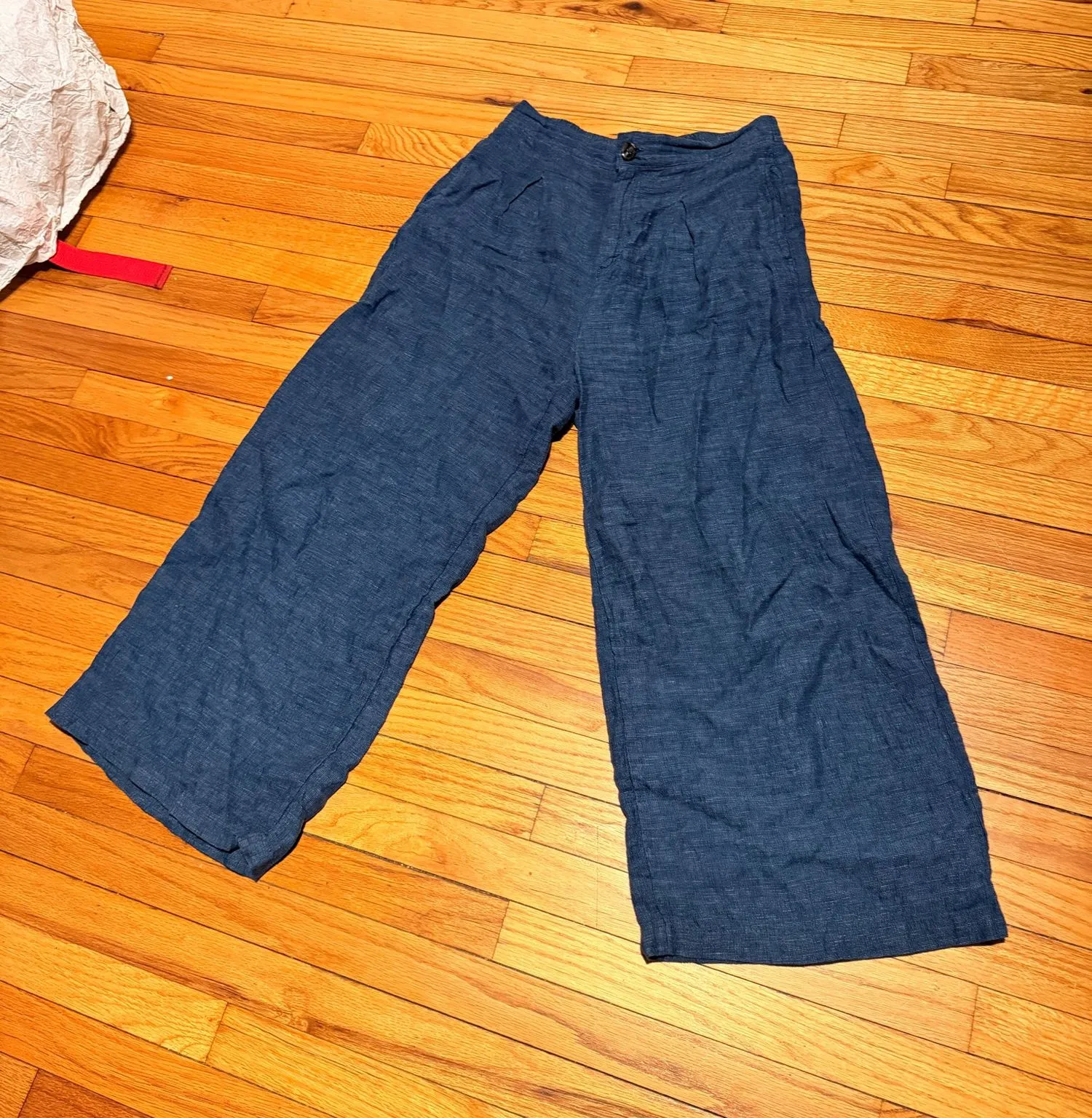 Halston 100% Linen Pleated Wide-Leg navy trousers coastal Pants Sz 10 coastal summer comfy blue elas... Show more