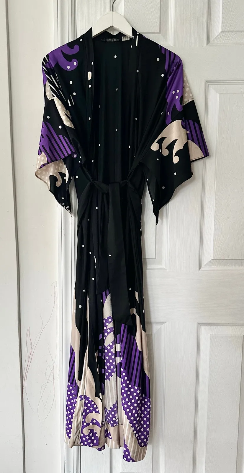 Size medium from Hanae Mori for Sandcastles. Vintage. Style D8109. 100% polyester satin slinky midi full length robe. Kimono sleeves. Black with purple cream stripe design. Some wear near hem of sleeves under arms. Preowned in otherwise good condition with no stains. Measurements: approximate 55” long All items come from a smoke free/pet free home. No trades or modeling. As always, offers are welcome. Thanks for stopping by!