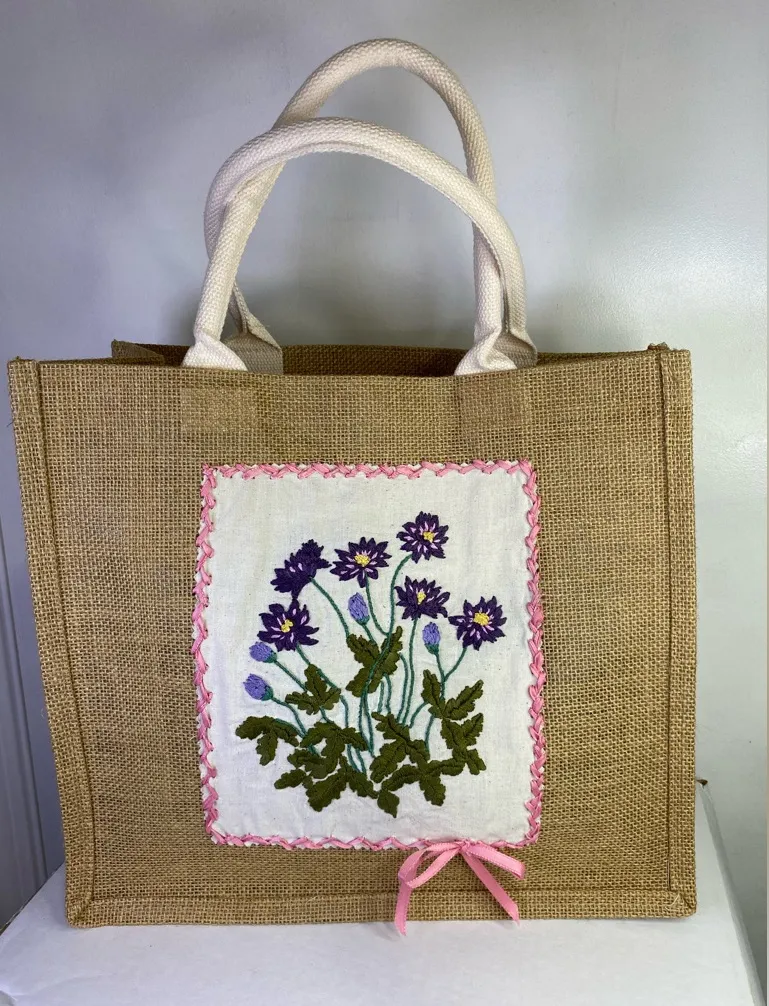 This charming jute tote bag combines natural texture with a beautiful handmade touch. The bag itself was pre-made, and a unique hand-embroidered cotton patch featuring a bouquet of purple flowers was carefully added to the front, giving it a one-of-a-kind artisanal accent. It measures approximately 14 inches wide, 13 inches high, and 7.5 inches deep, with sturdy cotton-blend handles for comfortable carrying. The interior has a laminated lining that helps protect your belongings and makes cleaning easy. Perfect for shopping, travel, or everyday use, this tote is both practical and beautifully personalized ā a lovely detail made with care and love.