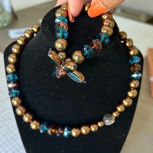 Handcrafted beaded gold and blue necklace and bracelet - $10 - From French