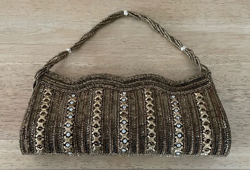 handcrafted gold and brown beaded clutch purse with crystal accents, rope strap - $29 - From Kate